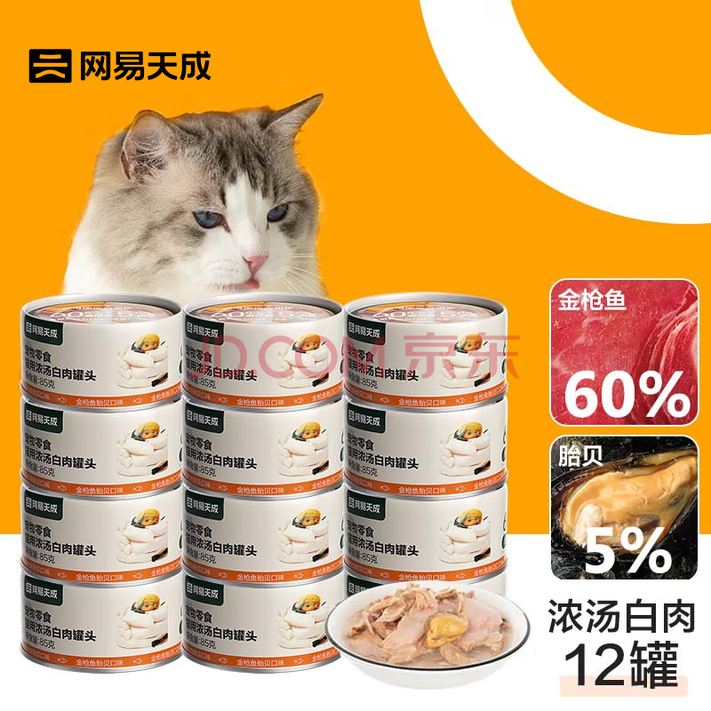 商品相册:网易严选猫罐头猫湿粮宠物零食浓汤白肉罐头 金枪鱼贻贝口味85克*12罐第