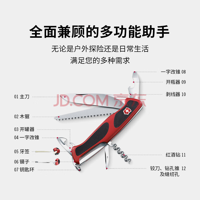 商品相册:维氏瑞士军刀新骑士55130mm户外刀具折叠刀防身小刀0.9563.C红黑第1张/共9
