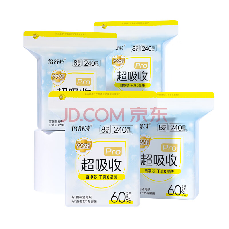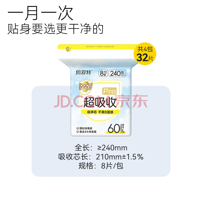 商品相册:倍舒特新国标认证超吸收棉柔卫生巾日用组合240mm32片 姨妈巾京东自营第