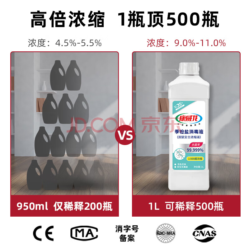 商品相册:康威龙 季铵盐消毒液复合双链多用途消毒家居环境物表空气消毒甲流感第
