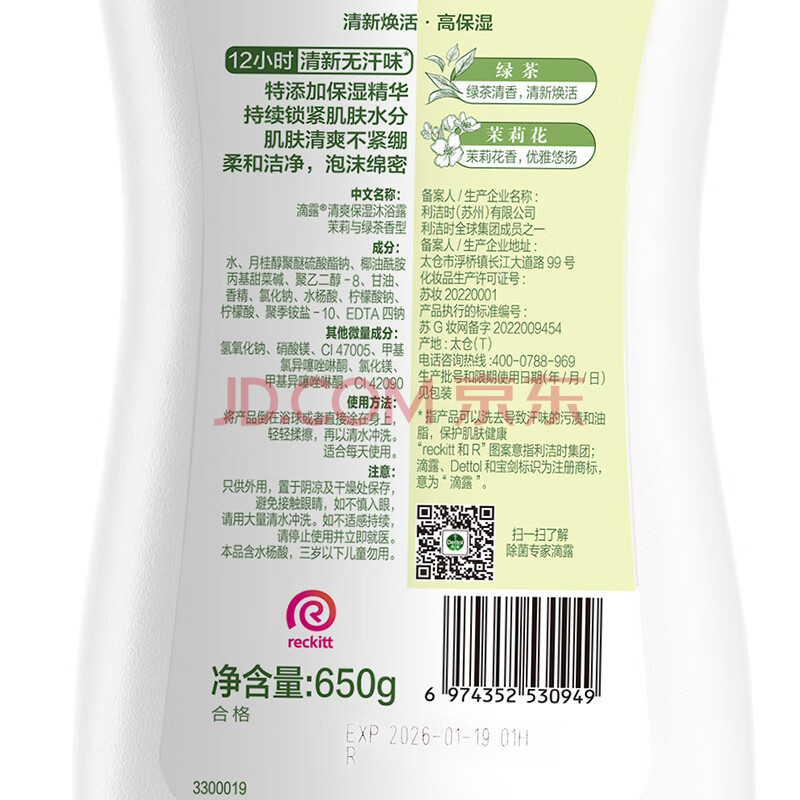 商品相册:滴露(Dettol)Dettol清爽保湿沐浴露 茉莉与绿茶清香650g 男士女士通用第