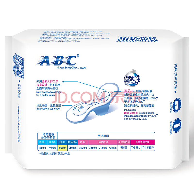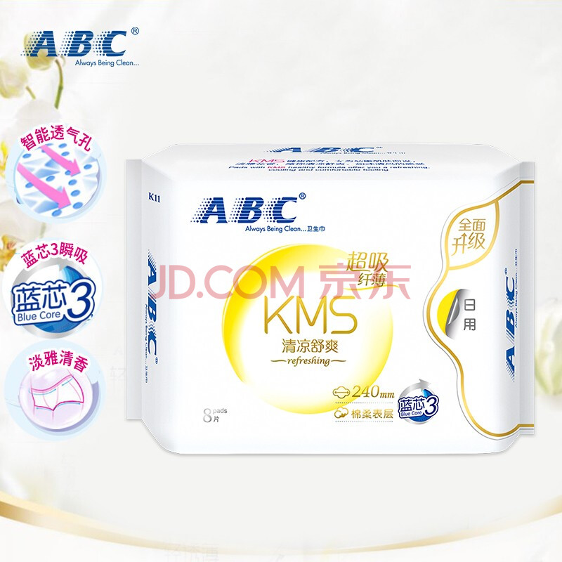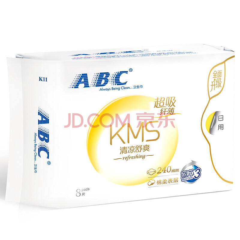 商品相册:ABCKMS纤薄健康配方超薄透气日用卫生巾京东自营240mm*8片第