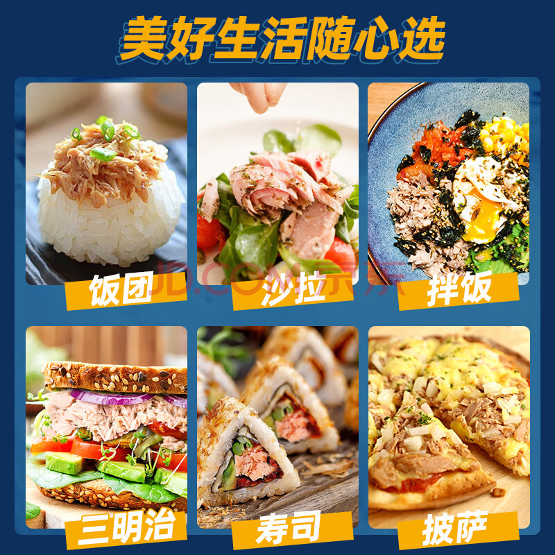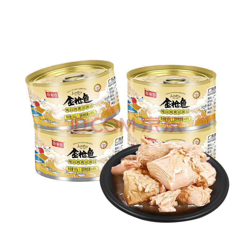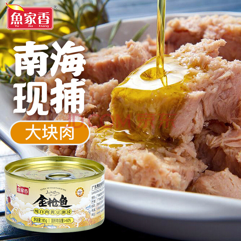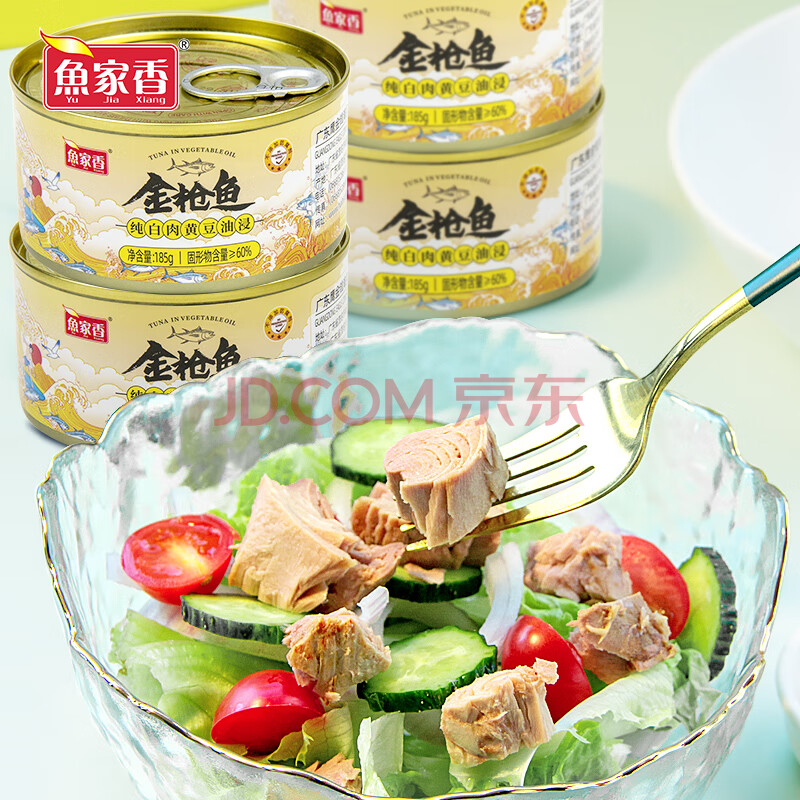商品相册:鱼家香纯白肉黄豆油浸金枪鱼罐头185g*4罐即食沙拉寿司鱼肉吞拿鱼罐头第1张/共8