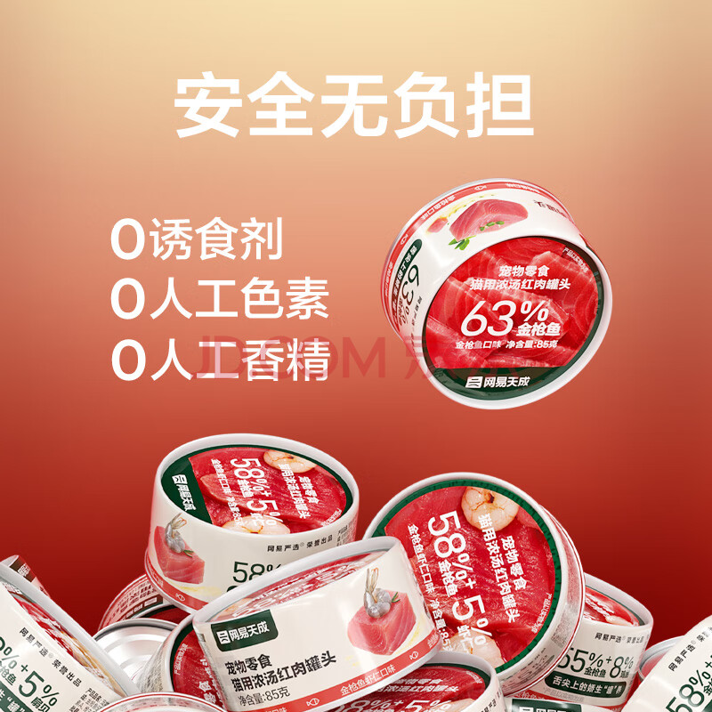 商品相册:网易严选猫罐头猫湿粮宠物零食浓汤红肉罐头 金枪鱼鸡丝口味85克*12罐第