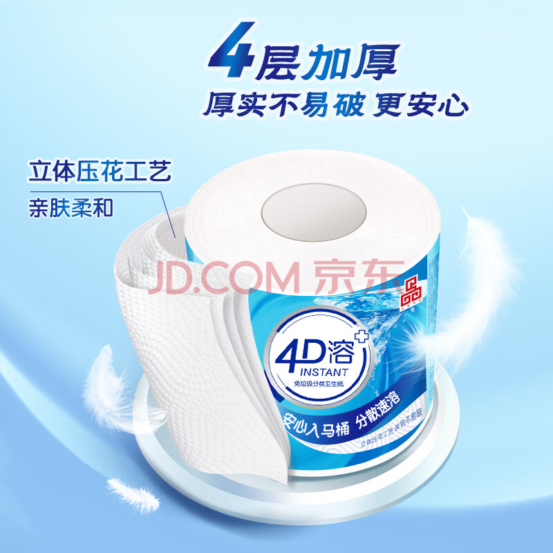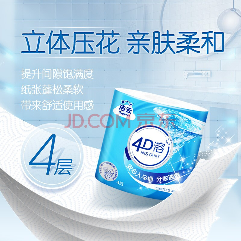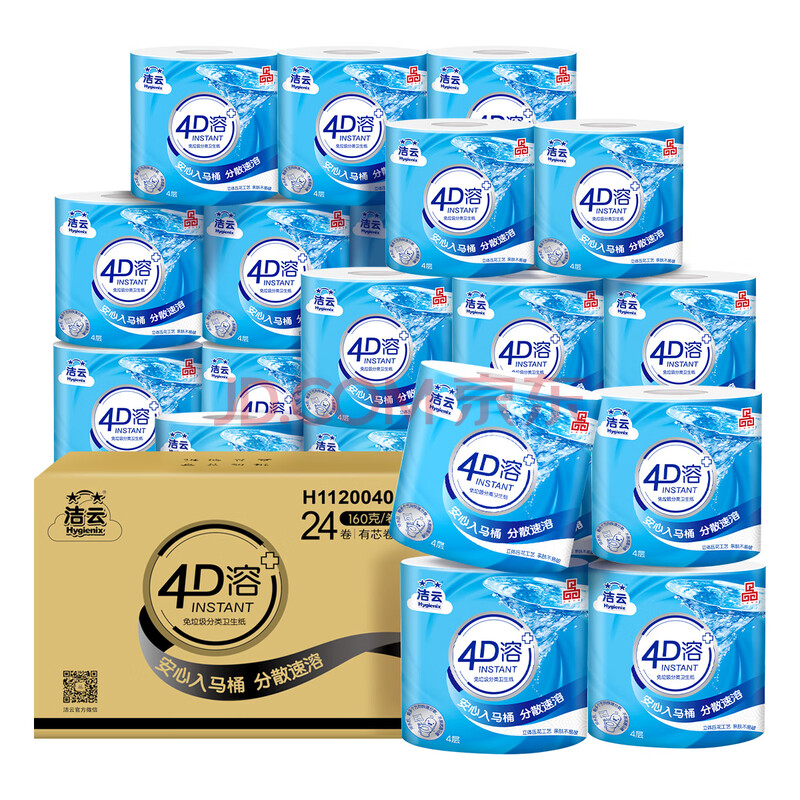 商品相册:洁云有芯卷纸 4D溶4层速溶160g卫生纸巾*24卷(立体压花) 整箱销售第