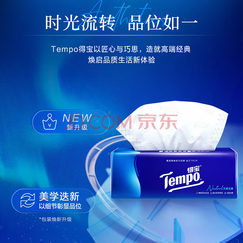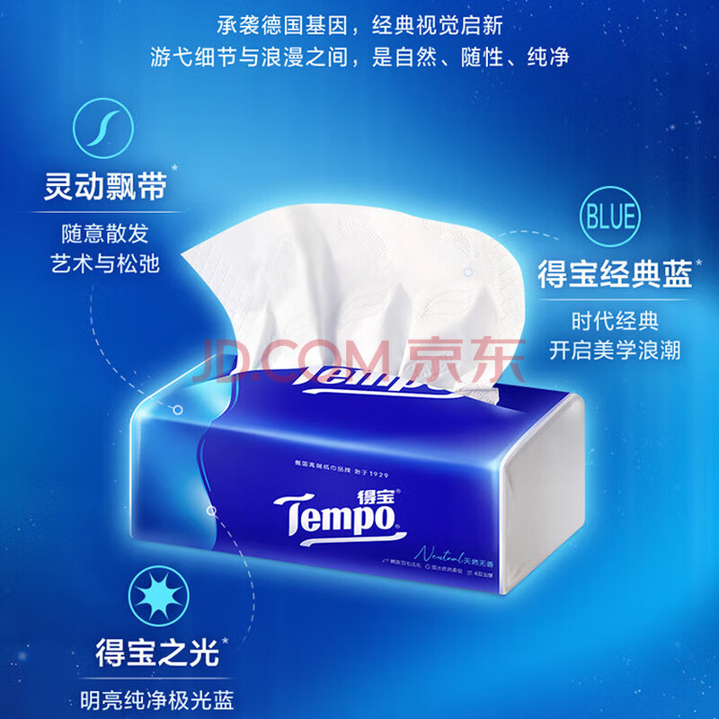 商品相册:得宝(TEMPO)抽纸 真M码 无香4层90抽*18包 湿水不易破 纸巾餐巾纸第