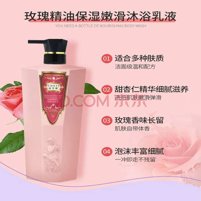 商品相册:迪菲娜玫瑰精油持久留香沐浴露900g男女通用香味持久保湿玫瑰香型沐浴液第