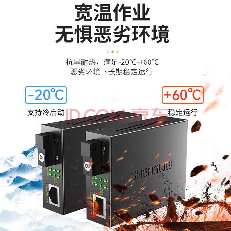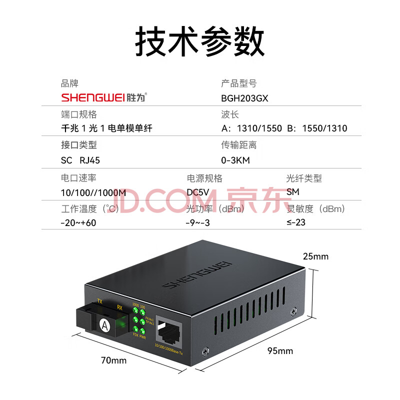 商品相册:胜为(shengwei)千兆单模单纤光纤收发器 光电转换器 SC接口电信级自适应3KM 一对装 BGH203GX第