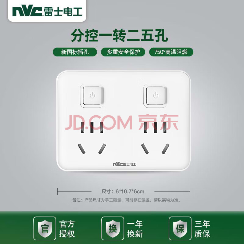 商品相册:NVC雷士电工 新国标安全插座转换器 插线板插排排插插头一转二分控 EC3220第