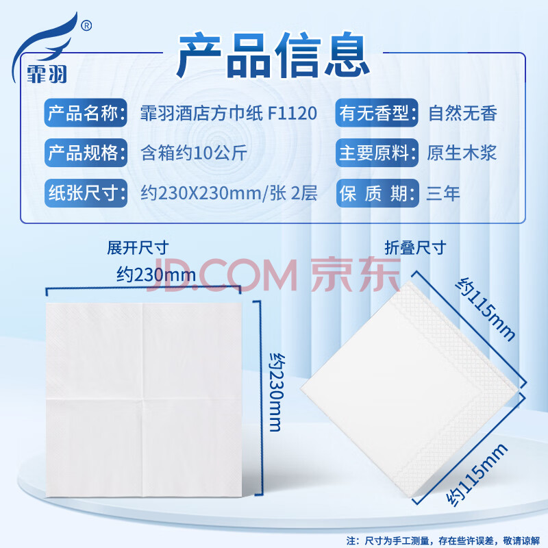 商品相册:霏羽餐巾纸10公斤整箱餐厅酒店230*230mm方巾纸饭店散装方块纸F1120 第