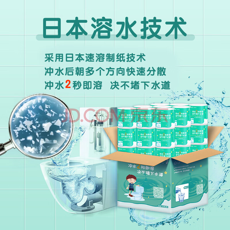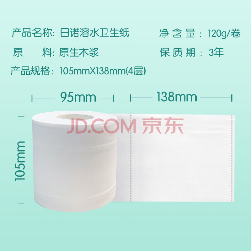 商品相册:日诺(Rinuo)水溶卫生纸可溶水卷纸融水有芯卷筒纸厕纸巾4层120克整箱27卷第