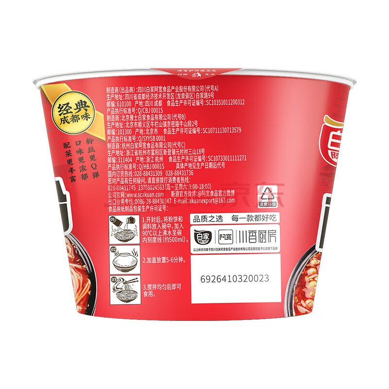 商品相册:白家陈记酸辣粉方便速食粉丝桶装108g*3桶 非油炸宿舍夜宵休闲零食第1张/共6