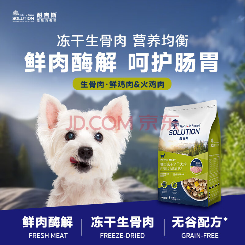 商品相册:耐吉斯冻干生骨肉狗粮酶解鲜肉成犬幼犬无谷低敏全价犬粮鸡肉味1.5kg第