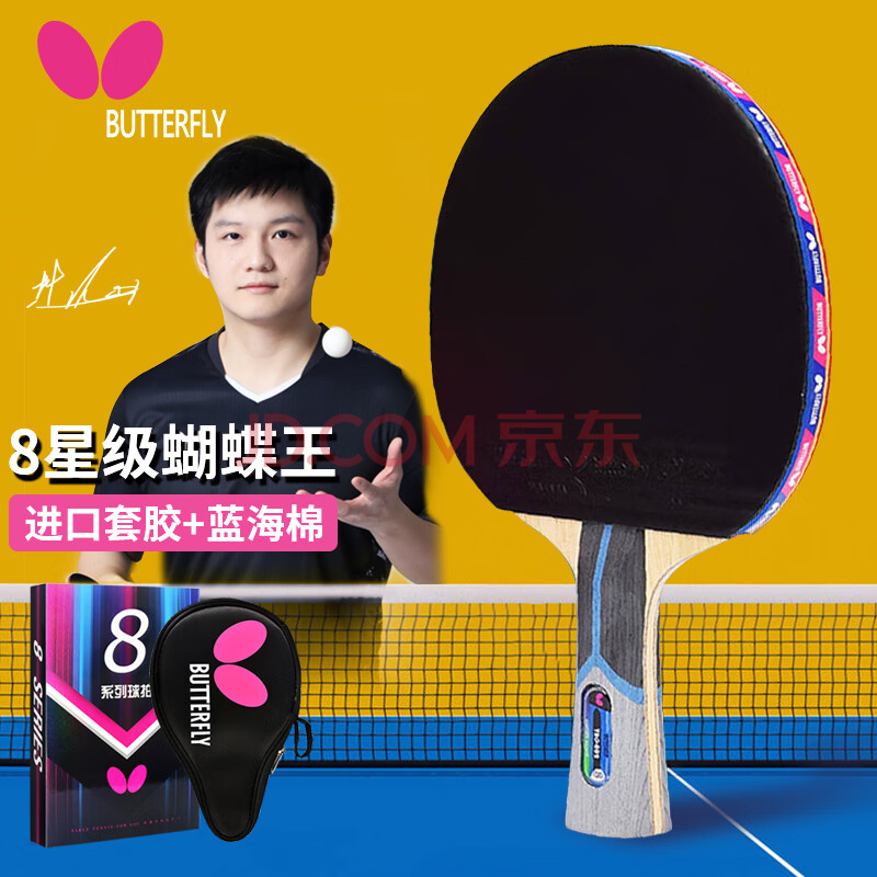 商品相册:蝴蝶(BUTTERFLY)蝴蝶乒乓球拍8星级802芳碳进攻型蓝海绵双面反胶蝴蝶王横拍/长柄第