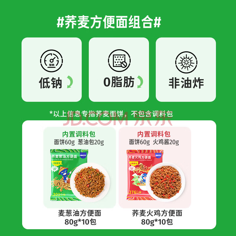 商品相册:鲨鱼菲特 0脂肪荞麦面方便面免煮泡拌面80g*20袋(葱油面*10+火鸡面*10)第