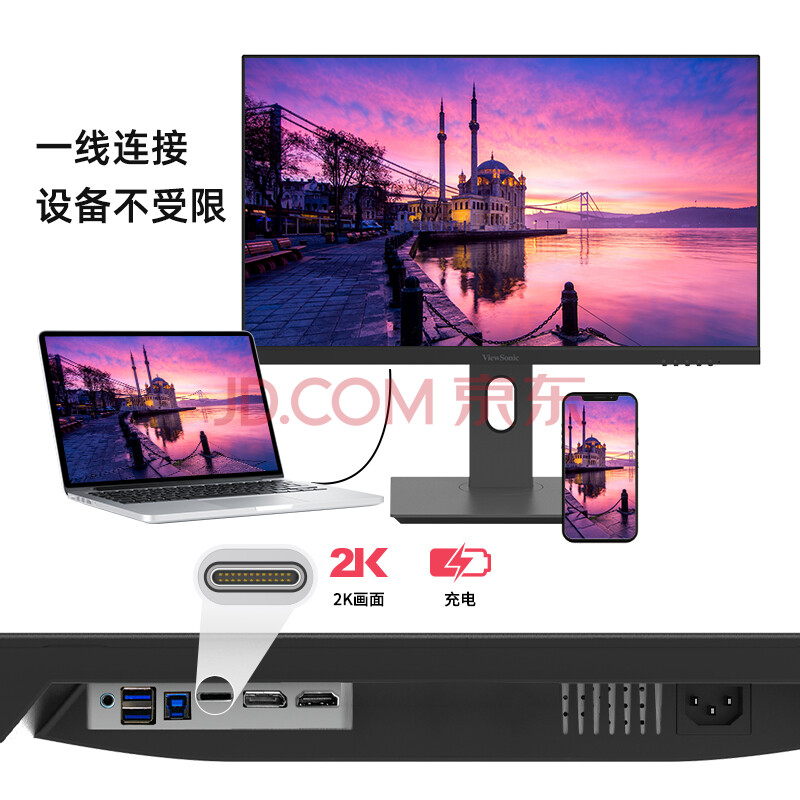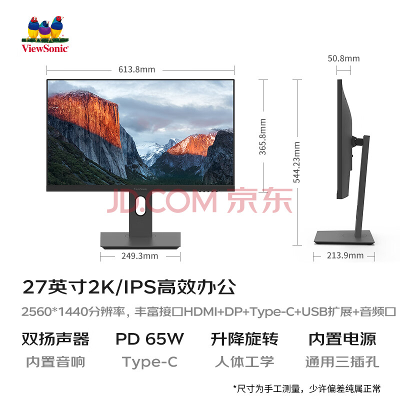 商品相册:优派27英寸 2K高清IPS显示器 Type-C65W 内置音响HDR 滤蓝光不闪屏 旋转升降办公设计电脑显示器VX2762第