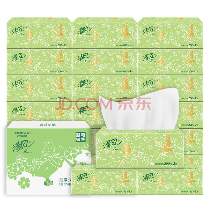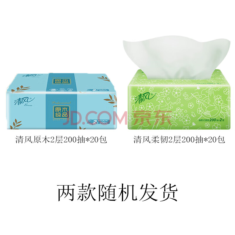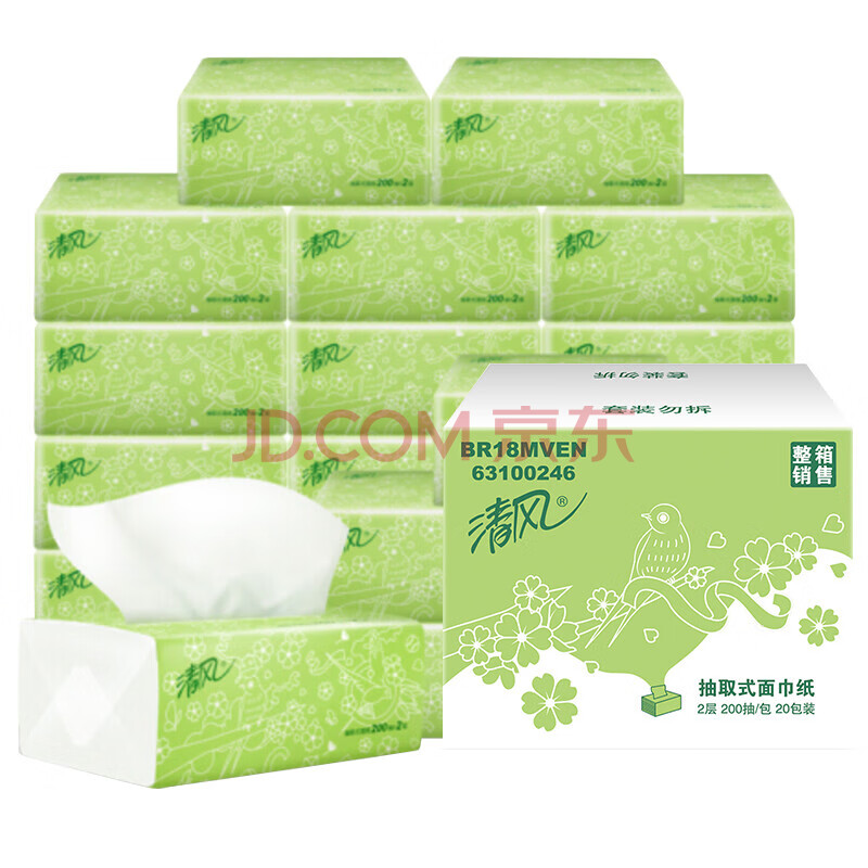 商品相册:清风抽纸 柔韧2层200抽软抽*20包纸巾(新老包装交替发货)整箱售卖第