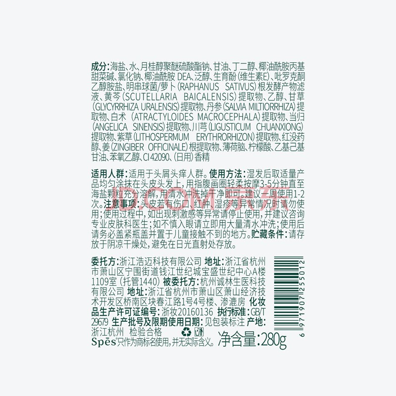 商品相册:Spes诗裴丝净爽海盐洗头膏280g 洗发水男士 女士 去屑洗发水 洗发露第