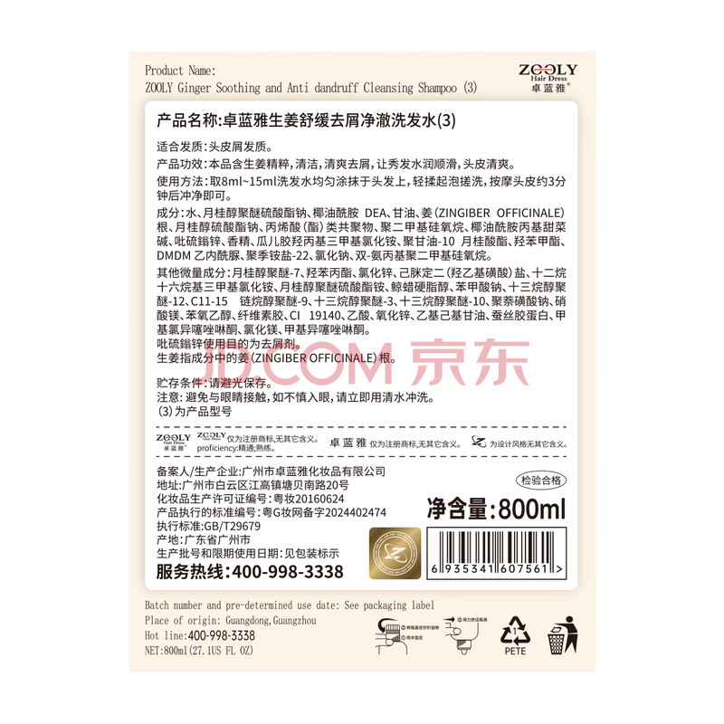 商品相册:卓蓝雅生姜去屑洗发水800ml (洗发露洗头膏温和清洁去屑男女通用 )第