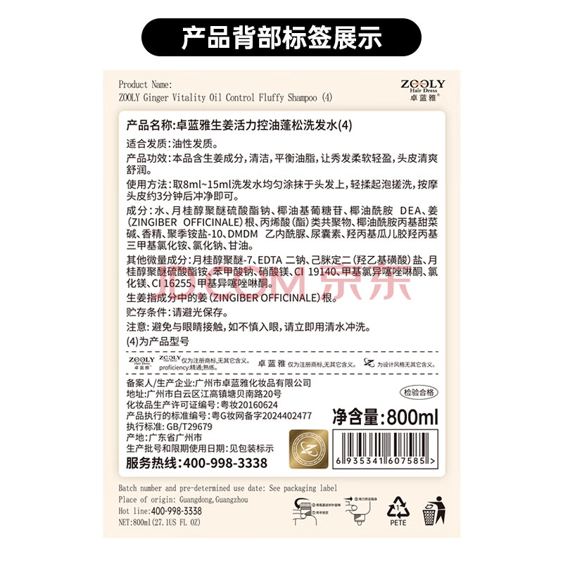 商品相册:卓蓝雅 生姜控油洗发水800ml (清爽控油洗发露洗头膏清爽 男女通用 )第