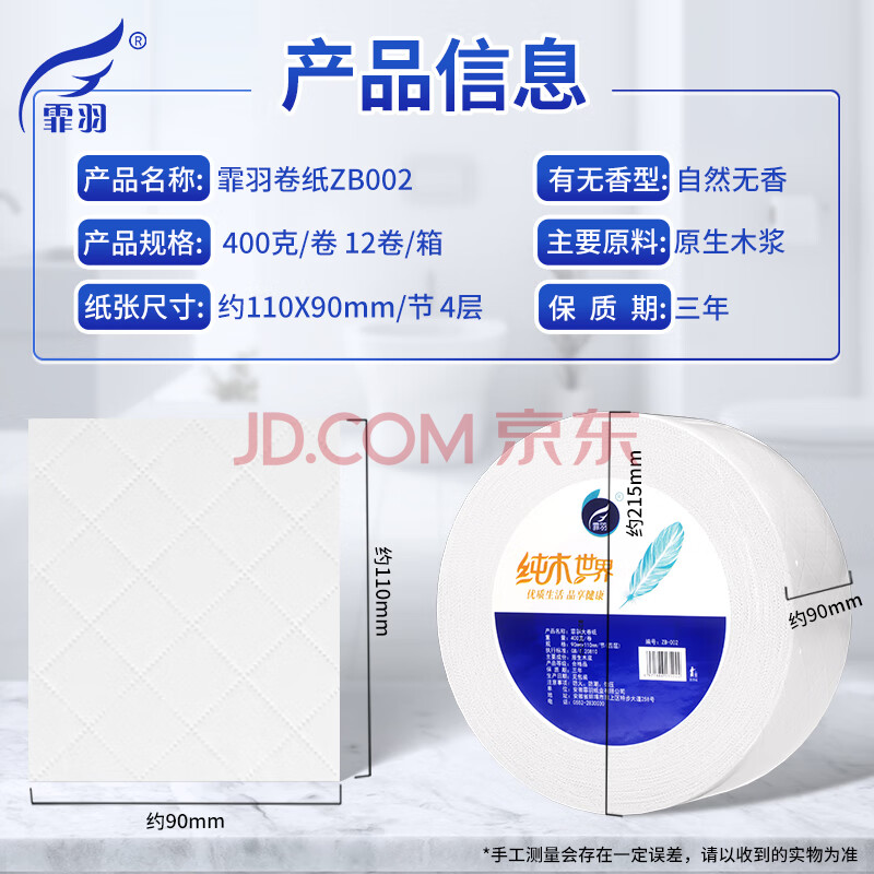 商品相册:霏羽有芯大卷纸4层400克*12卷大盘纸大圈商用卷纸卫生纸可溶水ZB002第