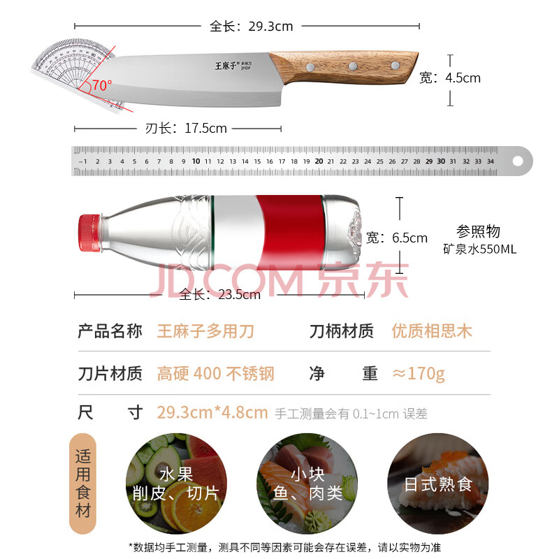 商品相册:王麻子菜刀厨房专用 厨师专业三德刀 寿司料理辅食水果刀切菜切肉刀具第