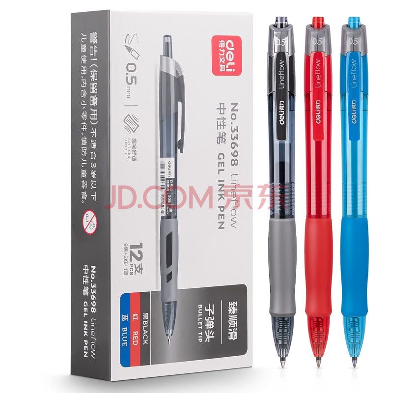 商品相册:得力(deli)臻顺滑S08按动办公中性笔签字笔 0.5mm子弹头12支/盒 9黑2红1蓝 33698第