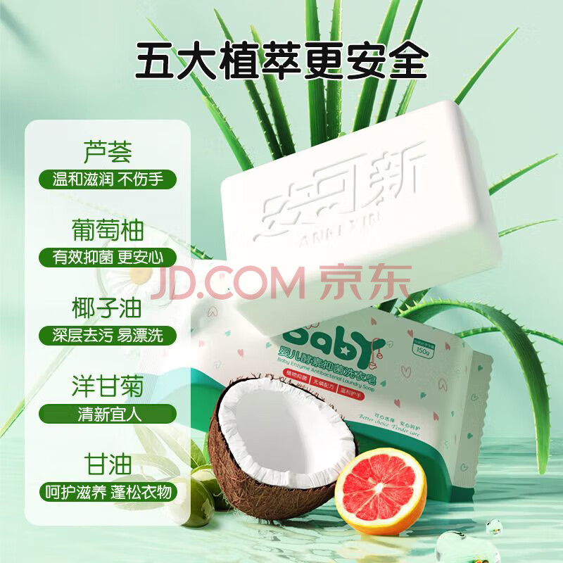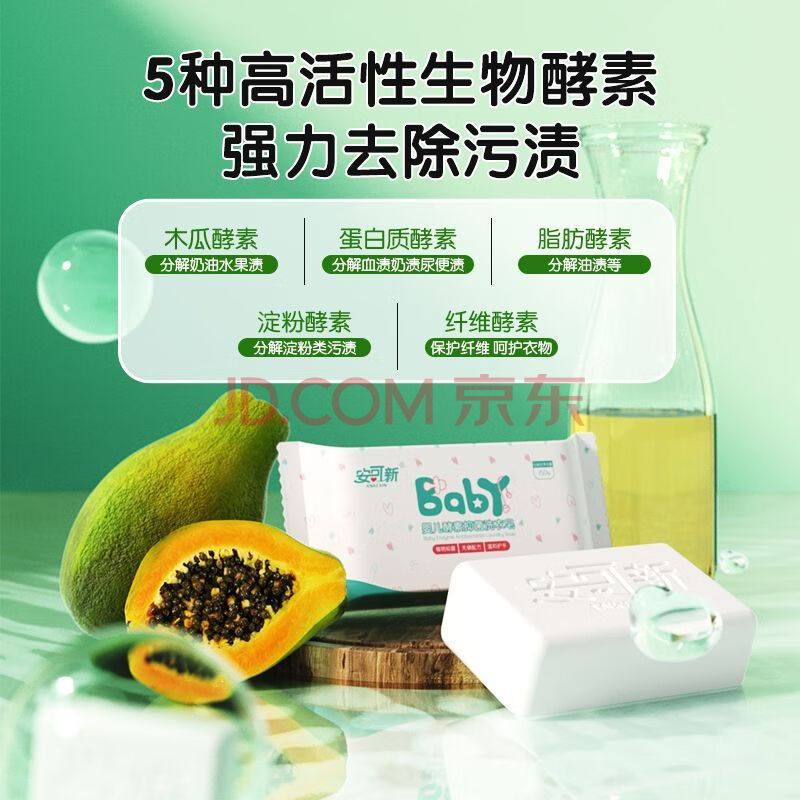 商品相册:安可新 儿童洗衣皂婴儿洗衣皂抑菌99%宝宝植物酵素肥皂洗衣液150g*2包第