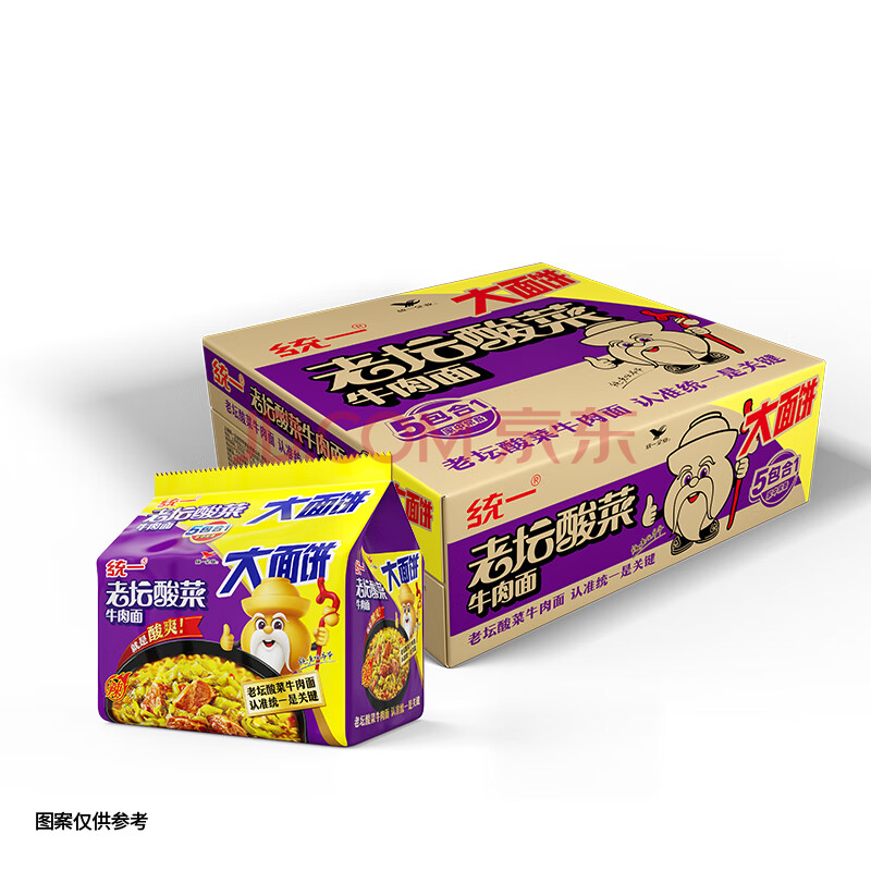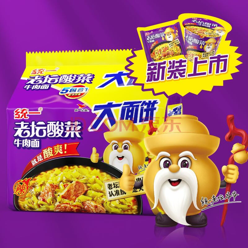 商品相册:统一 老坛酸菜牛肉面大面饼五合一方便面150g*5袋 新老包装随机发货第