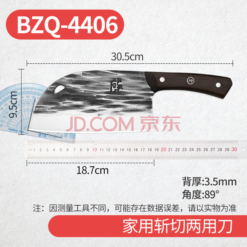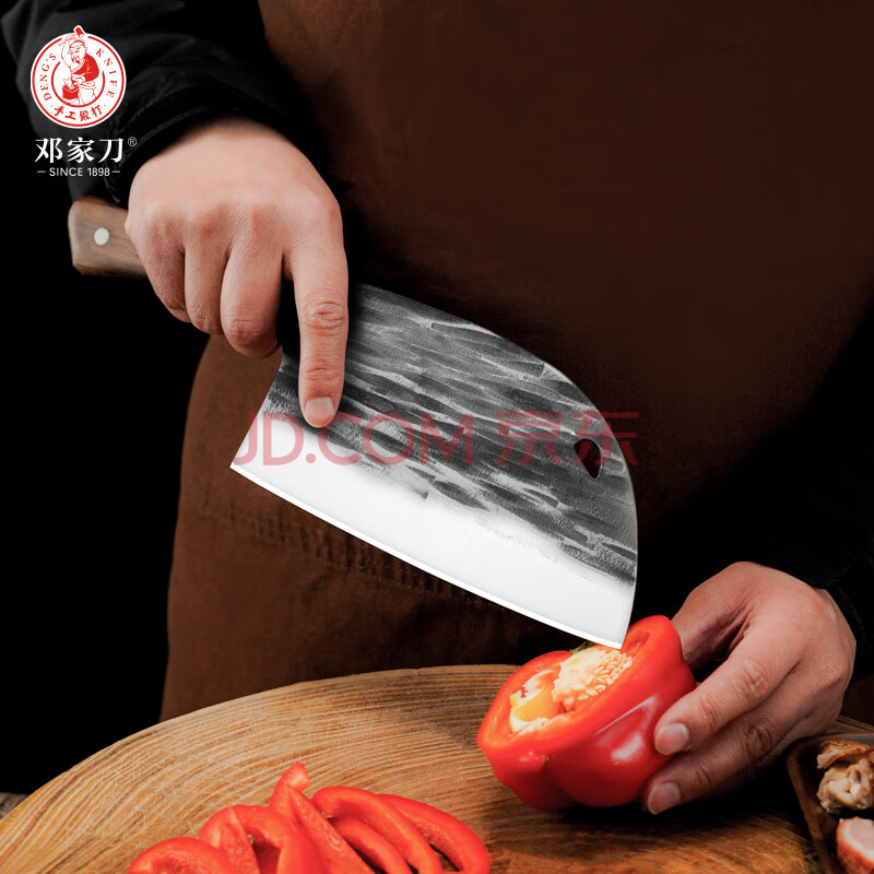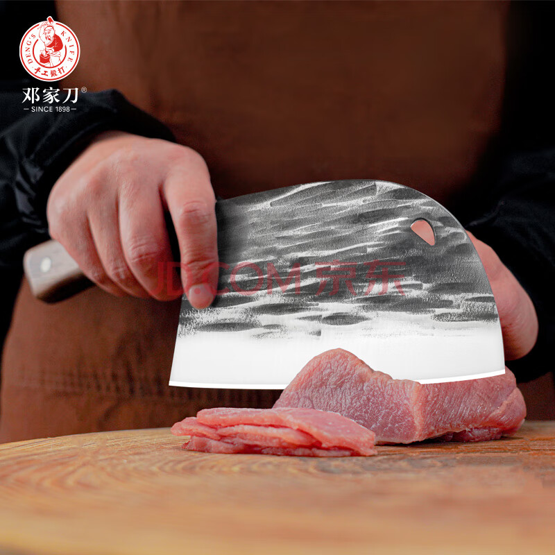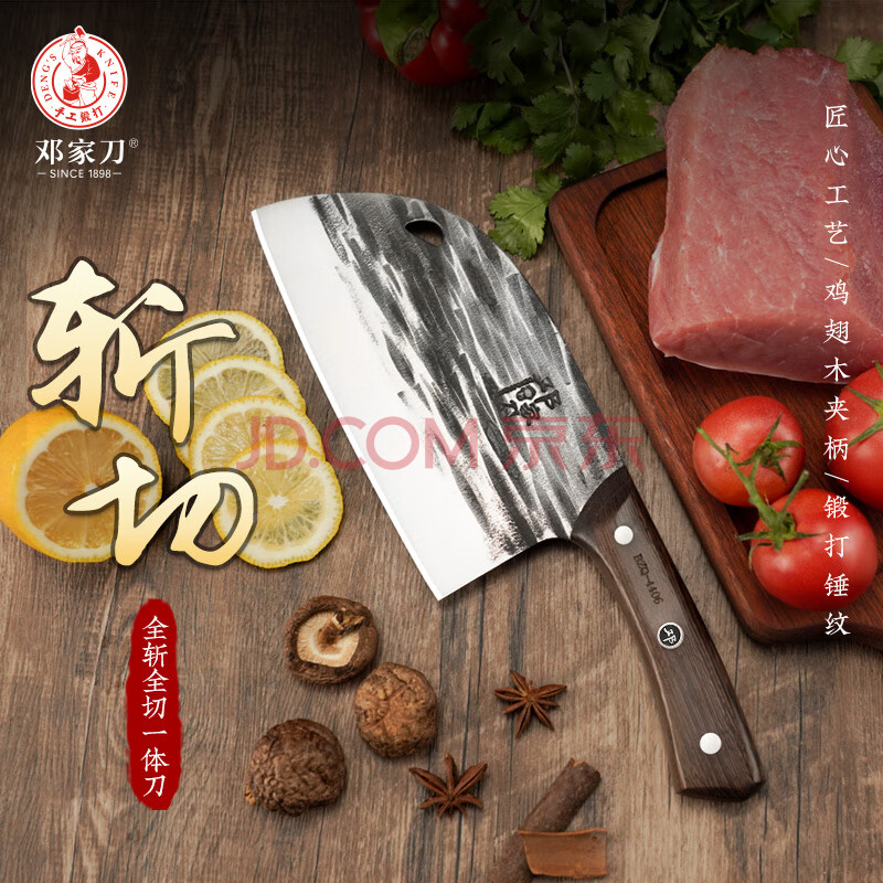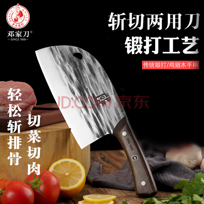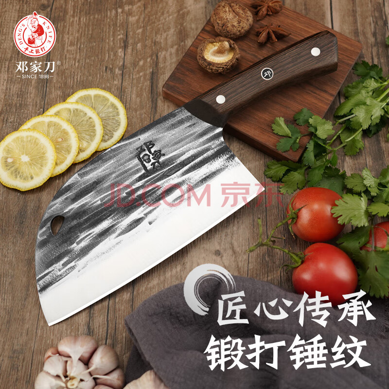 商品相册:邓家刀锤纹真锻打不锈钢菜刀鸡翅木刀柄圆头斩切两用刀 BZQ-4406第