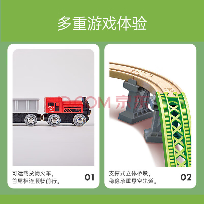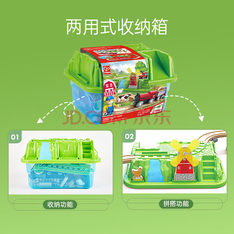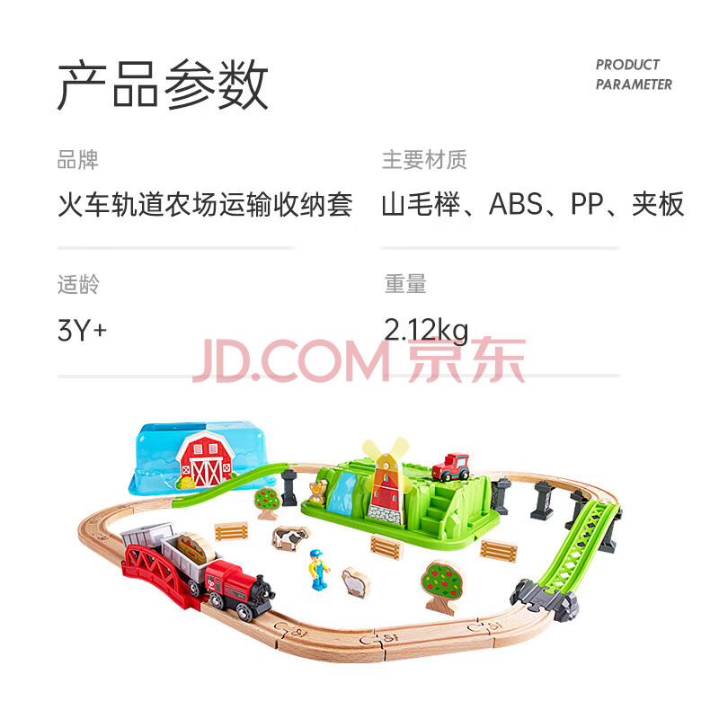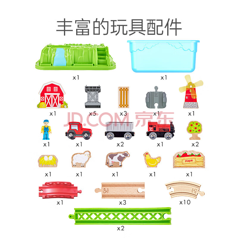 商品相册:Hape(德国)儿童小火车轨道玩具木质拼插积木开心农场收纳套3岁+E3772第