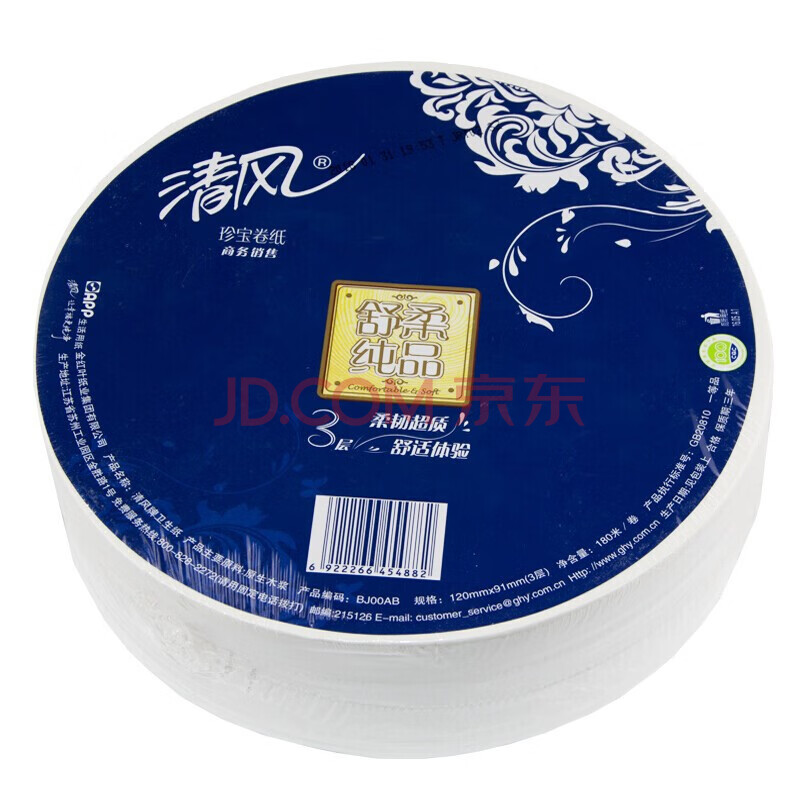 商品相册:清风舒柔纯品3层平纹180米珍宝大盘卷纸擦手纸12卷/箱BJ00AB第