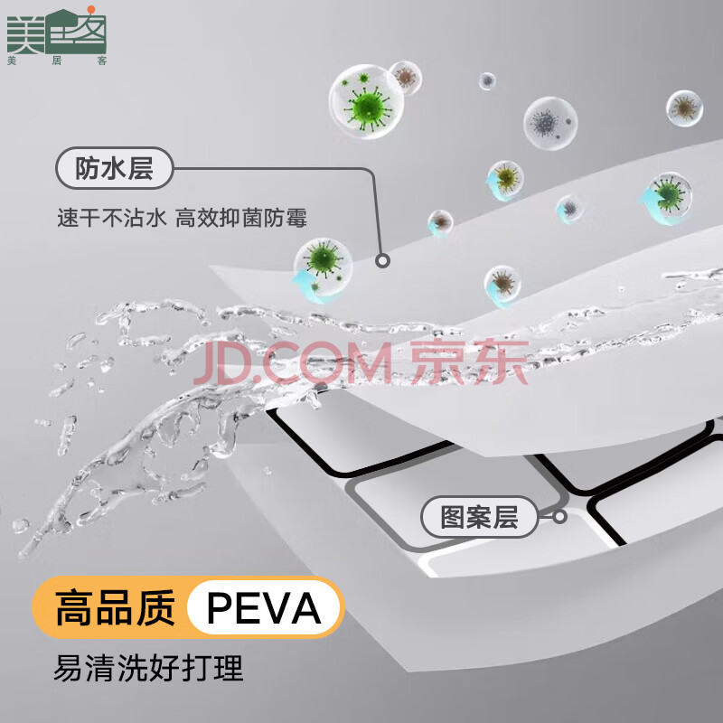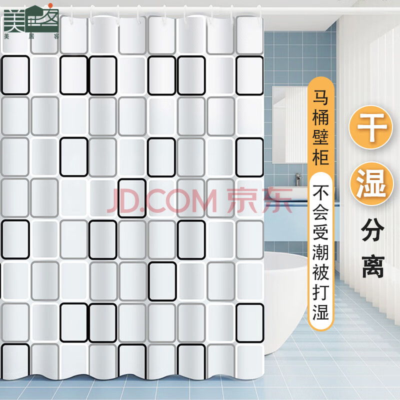 商品相册:美居客 浴帘 浴室帘 防水防霉 免打孔窗帘洗澡隔断帘1.5*2.0M(黑白方块)第