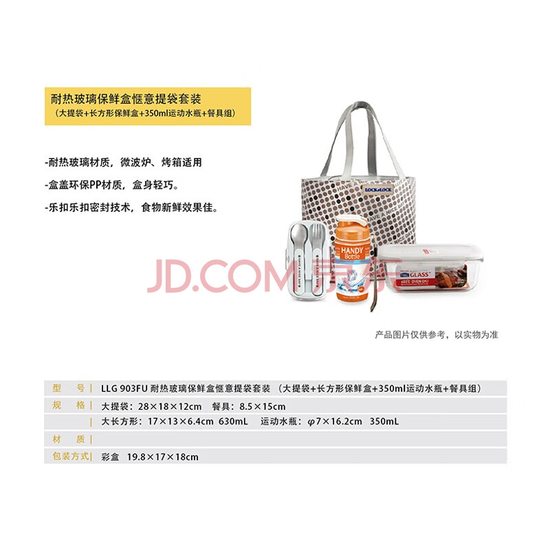 商品相册:LOCK&LOCK玻璃保鲜盒(大提袋+长方形保鲜盒+350ml运动水瓶+餐具) LLG903FU第