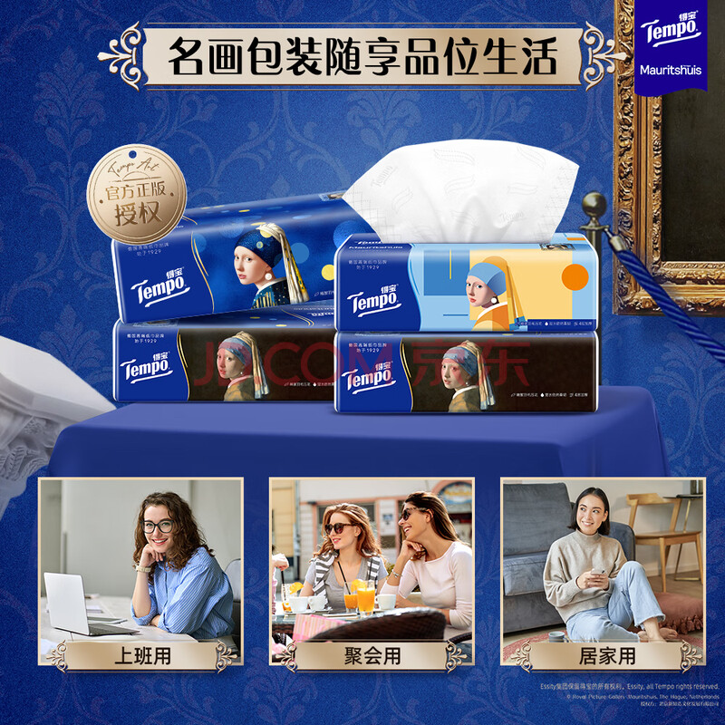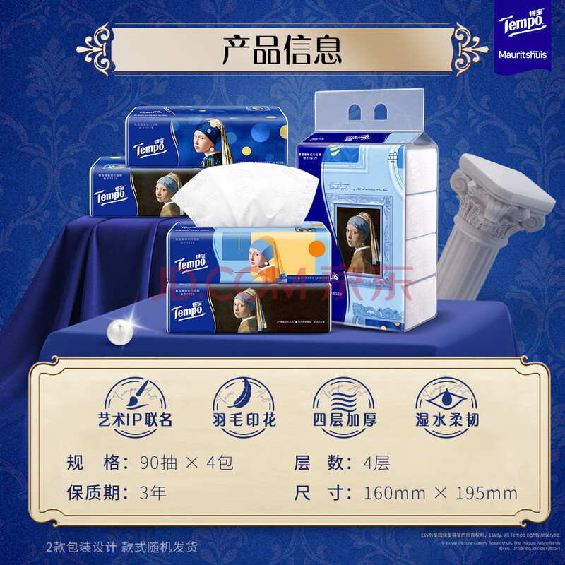 商品相册:得宝(TEMPO)戴珍珠耳环的少女联名艺术抽纸 4层90抽*4包 湿水柔韧 餐巾纸第