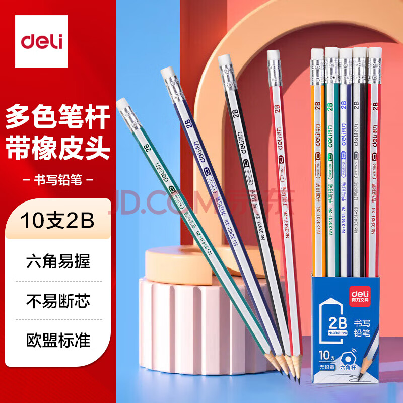 商品相册:得力(deli)10支2B铅笔经典彩色条纹六角杆铅笔带橡皮头学生书写素描绘图铅笔33431-2B学生开学文具第1张/共6