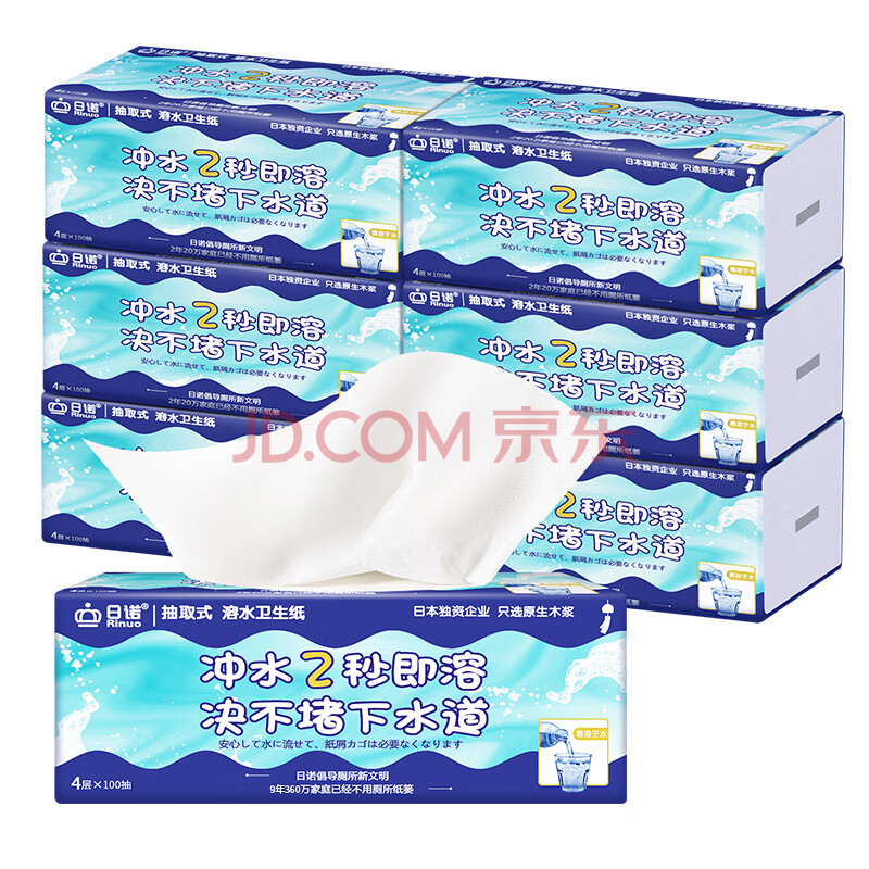 商品相册:日诺(Rinuo) 溶水抽纸整箱母婴抽取式厕纸110抽4层 6包/件 第