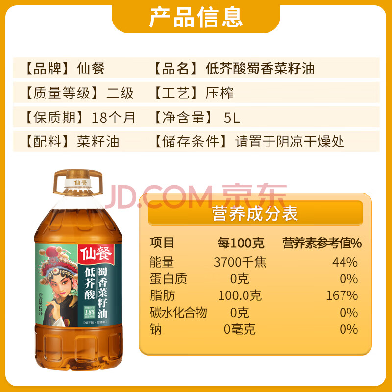 商品相册:仙餐牌食用油 低芥酸蜀香 四川压榨非转基因菜籽油 5L 四川风味第