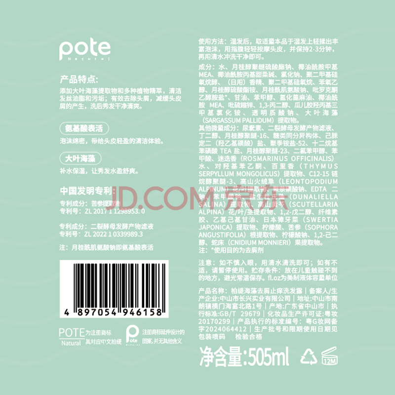 商品相册:柏缇海藻去屑止痒洗发水 舒缓留香氨基酸男女通用洗发露洗头膏 505ml第