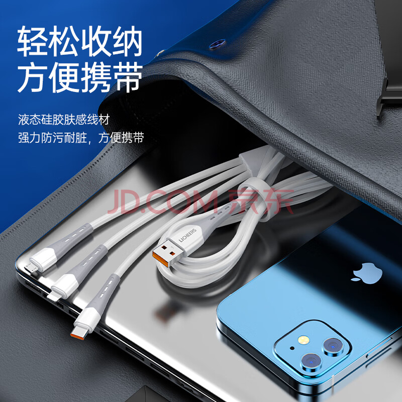 商品相册:领臣 数据线三合一6A快充66W充电线器适用苹果iPhone14/Type-c安卓手机多功能一拖三头车载LC-568第