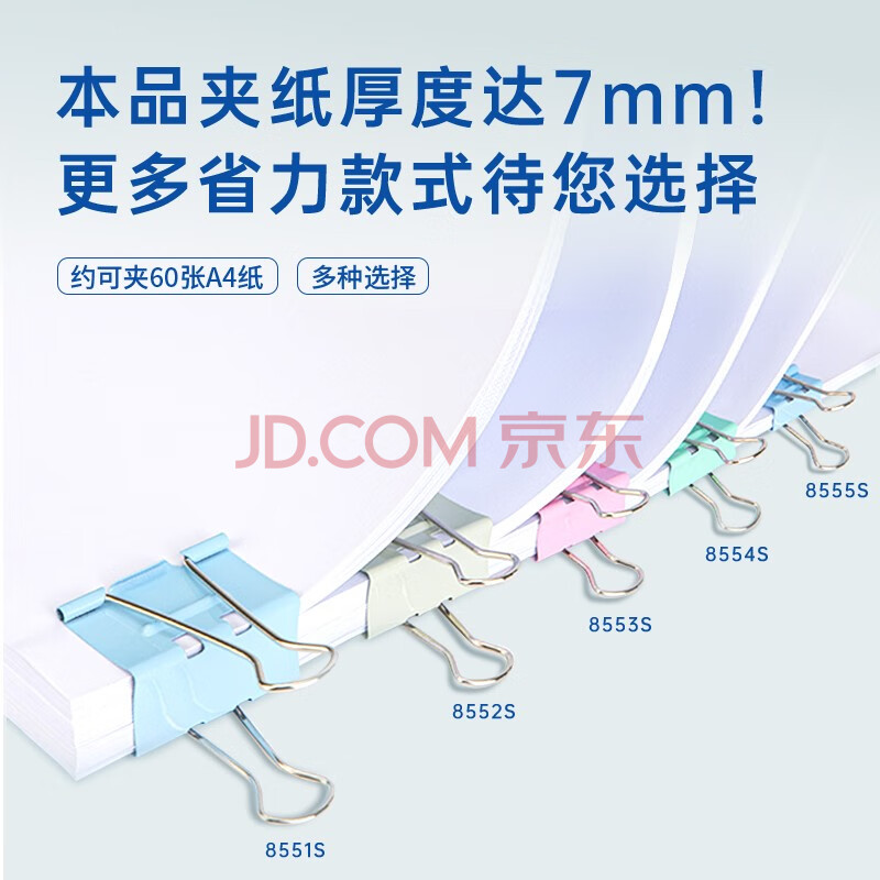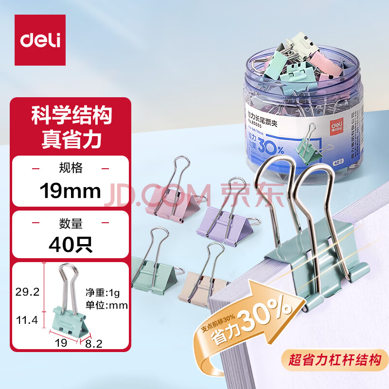 商品相册:得力(deli)40只19mm省力彩色长尾夹票夹 5#金属燕尾夹票据夹子 办公用品 40只/盒 8555S第