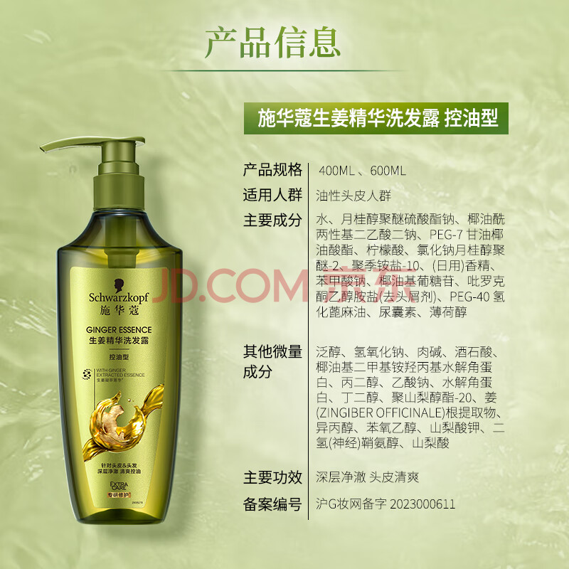 商品相册:施华蔻(Schwarzkopf)生姜精华洗发露400ml 净爽控油蓬松柔顺洗发水 无硅油洗头膏第