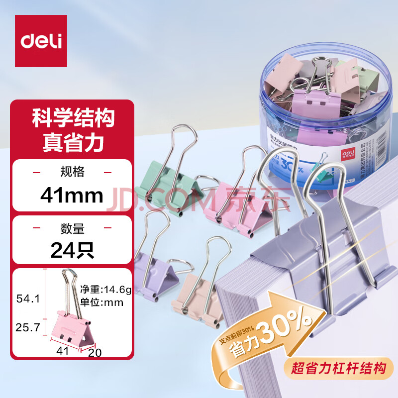 商品相册:得力(deli)24只41mm省力彩色长尾夹票夹 2#大号金属燕尾夹票据文件夹子 办公用品 24只/筒 8552S第