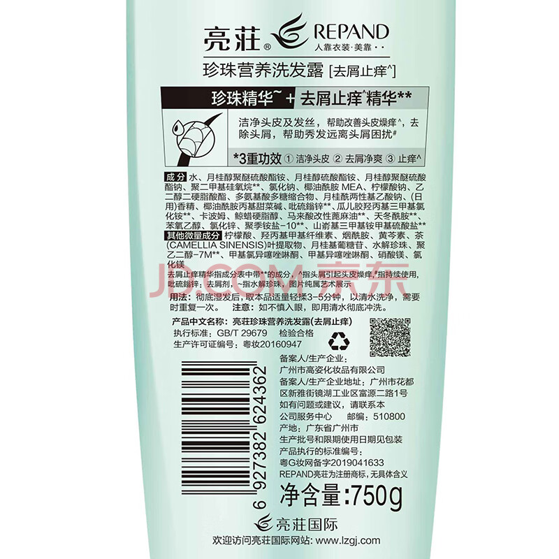 商品相册:亮荘珍珠营养洗发露750g去屑止痒洗发水清爽洁净改善头皮燥痒第
