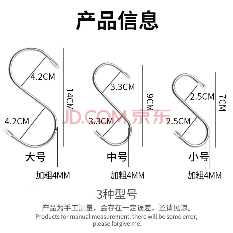商品相册:秉优不锈钢S钩加粗4mm肉钩 厨房挂钩免打孔万能s型挂钩 7厘米14只装第
