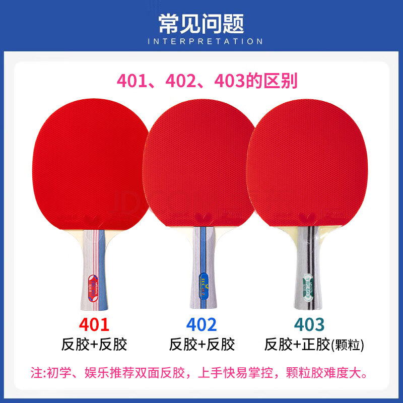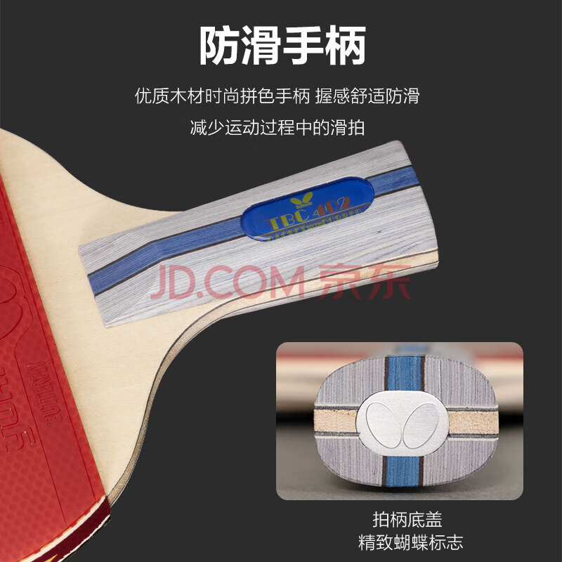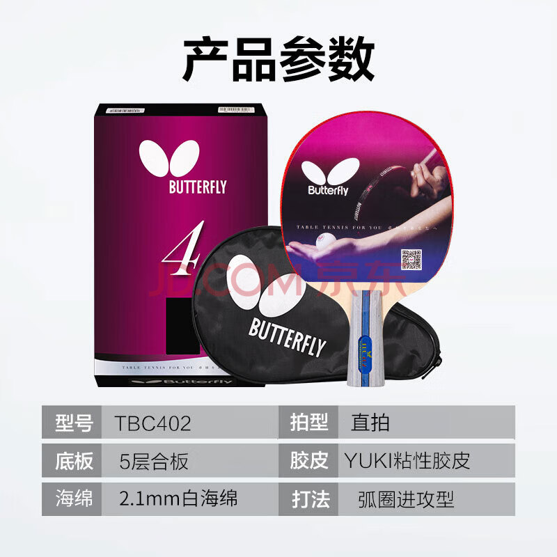 商品相册:蝴蝶(Butterfly)四星级乒乓球拍直拍 双面反胶皮5层合板底板兵拍单只402 内附拍套第