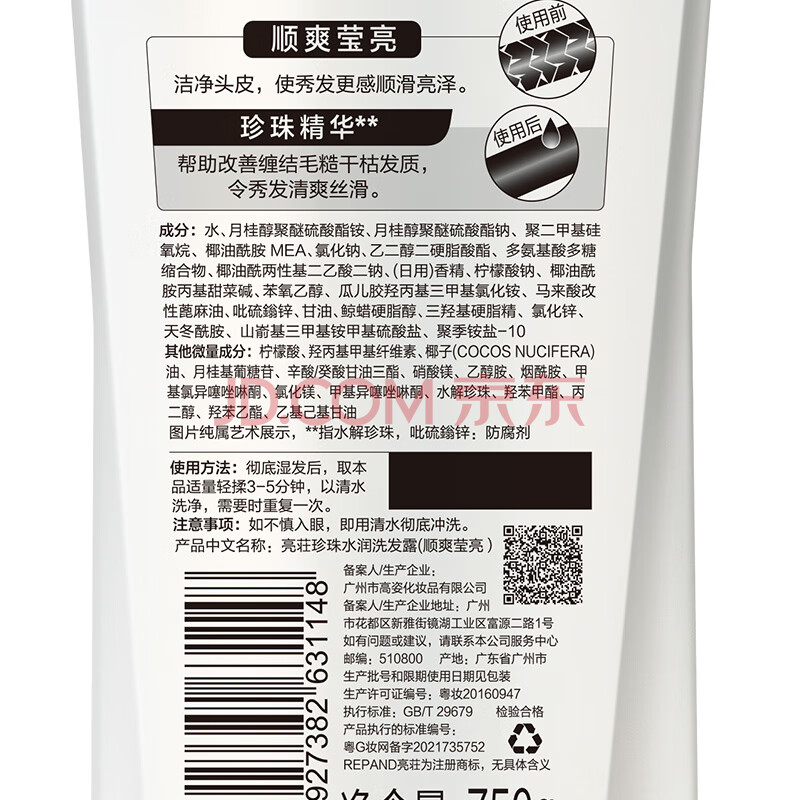商品相册:亮荘珍珠水润洗发水750g顺爽莹亮洗发露 改善枯黄暗哑养护秀发第