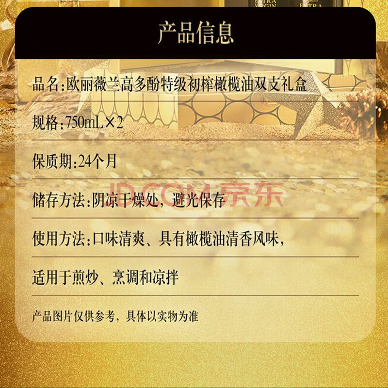 商品相册:欧丽薇兰(Olivoila) 高多酚橄榄特级初榨橄榄油750ml*2 套盒装(新老包装随机发货)第