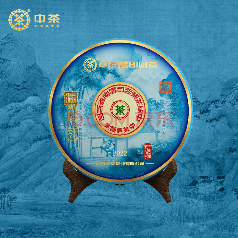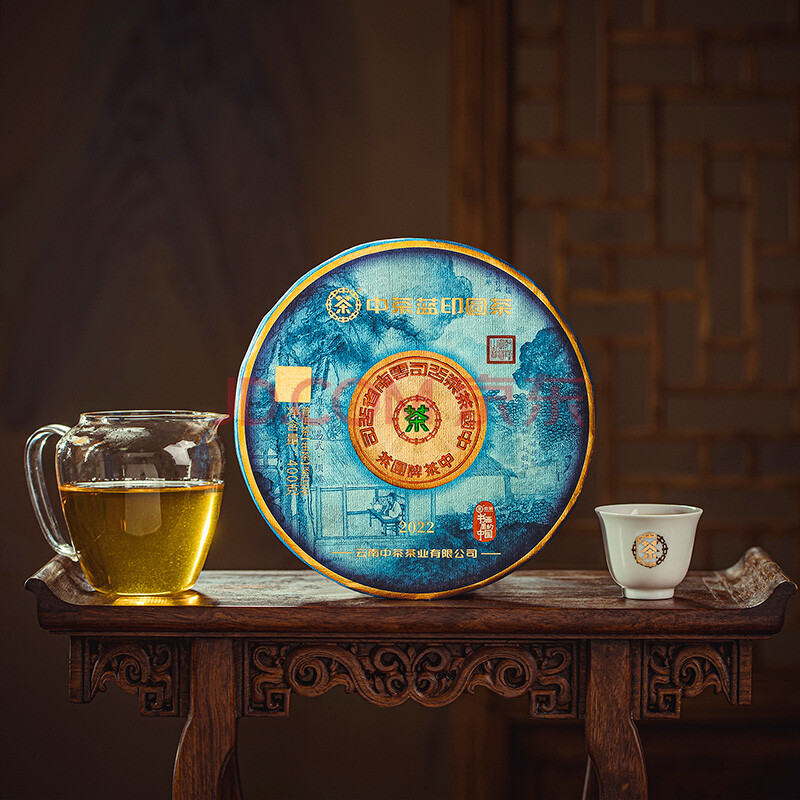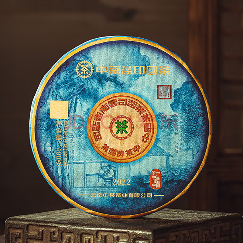 商品相册:中茶普洱茶2022年蓝印圆茶普洱生茶班章易武坝糯三峰拼配饼茶400g第