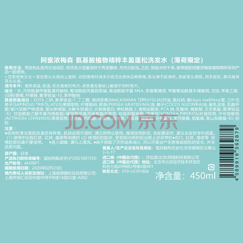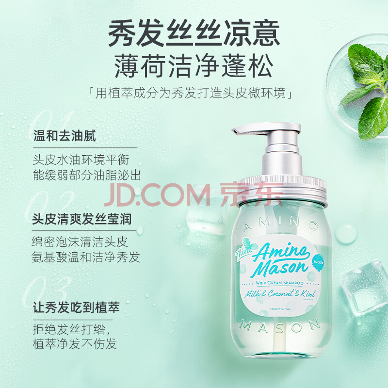 商品相册:Amino mason 阿蜜浓梅森薄荷蓬松控油氨基酸洗发水 450ml 日本原装进口无硅油第